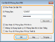 Nhấp vào để xác minh ID và mã PIN đã nhập là chính xác. Chức năng này không khả dụng nếu máy và máy tính được kết nối thông qua cổng USB hay WSD (Dịch Vụ Web trên Thiết bị).