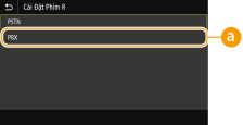 Chọn <PBX> khi bạn muốn máy được kết nối thông qua PBX (Tổng Đài Nhánh Riêng). Cài đặt chức năng của phím <R> được hiển thị trên màn hình Các Tính Năng Cơ Bản cho chức năng Fax thành <Tiền Tố> hoặc <Hooking>. Nếu bạn chọn <Tiền Tố>, hãy đăng ký mã tiền tố trên màn hình kế tiếp. Nhập mã tiền tố bằng các phím số, chọn <T.dừg>, và sau đó chọn <Áp Dụng>. Nếu bạn không chèn một khoảng ngừng, mã tiền tố sẽ không được đăng ký.