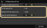 <Sử Dụng Tự Động Quay Số Lại> <Tắt> <Bật>  <Số Lần Quay Số Lại> 1 đến 2  đến 10 (lần) <Khoảng Thời Gian Quay Số Lại> 2  đến 99 (phút) <Quay Số Lại Khi Xảy Ra Lỗi> <Tắt> <Bật>  |
