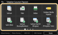 Anda boleh menambah butang pintasan ke skrin Rumah untuk fungsi yang kerap digunakan seperti <Salinan>, <Faks> dan <Imbas>. Contohnya, anda boleh menjalankan tugas dengan lebih cepat dan cekap dengan menugaskan turutan tetapan (cth. "Imbas kedua-dua muka dokumen asal, simpannya sebagai fail PDF yang dimampat tinggi dan hantarkannya melalui e-mel") ke butang tunggal.
