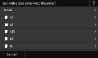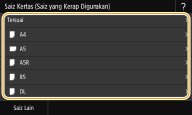 Jika skrin yang ditunjukkan di atas tidak dipaparkan apabila kertas dimuatkanJika anda sentiasa memuatkan kertas yang sama dalam dulang pelbagai guna, anda boleh melangkau operasi tetapan kertas dengan mendaftar saiz dan jenis kertas sebagai tetapan lalai. Apabila tetapan lalai didaftarkan, namun skrin ditunjukkan di atas tidak dipaparkan. Untuk memaparkan skrin, pilih <Tentukan Apabila Memuatkan Kertas> (Mendaftar Tetapan Kertas Lalai untuk Dulang Pelbagai Guna). |