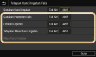 Untuk mencetak dokumen yang diterima dalam memori, tetapkan <Gunakan Kunci Ingatan> kepada <Tak Akt>. Semua dokumen dalam memori dicetak.