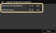 Pilih <Aktif> untuk mencetak laporan dihantar dan diterima berasingan, atau <Tak Akt> untuk mencetak kedua-dua laporan pada satu helaian.