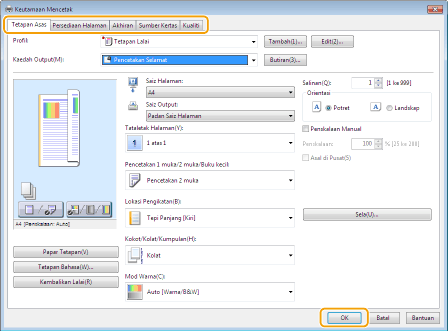 Tentukan tetapan cetakan sebagaimana diperlukan dan klik [OK].
