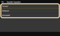 Anda boleh guna <Laras Halus> untuk melaraskan kepadatan toner setiap warna kepada tiga peringkat kepadatan: kepadatan tinggi, kepadatan sederhana, kepadatan rendah. |