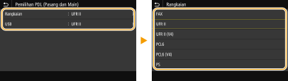 Pilih sama ada mahu menukar antara pencetakan di atas kertas bersaiz A4 dan Surat jika satu daripada saiz kertas dimuatkan tetapi yang lain tidak. Apabila anda memilih <Aktif>, jika anda menentukan kertas bersaiz A4 untuk dicetak daripada komputer tetapi kertas bersaiz A4 tidak dimuatkan dalam mesin, ia akan mencetak dokumen anda di atas kertas bersaiz Surat.