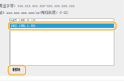 2 | 指定例外地址。 在 [要注册的地址] 文本框中输入 IP 地址(或 IP 地址范围),然后单击 [添加]。 检查是否有输入错误 IP 地址输入形式 | 说明 | 示例 | 输入单个地址 | IPv4: 用点分隔数字。 | 192.168.0.10 | IPv6: 用冒号分隔字母数字字符。 | fe80::10 | 指定地址范围 | 在地址之间插入连字符。 | 192.168.0.10-192.168.0.20 | 指定具有前缀的地址范围 | 输入地址,然后输入斜杠和表示前缀长度的数字。 | 192.168.0.32/27