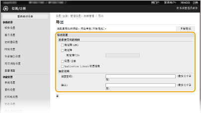 使用字母数字字符输入密码,将导出的数据加密。在 [确认] 中输入相同的密码。如果选中 [地址簿] 或 [设置/注册] 复选框,则在未设置加密密码的情况下无法导出数据。