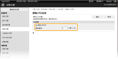 2 | 根据需要配置设置。 ![]() [使用LPD打印] 选择此复选框可通过 LPD 打印。不使用 LPD 打印时,请取消选中此复选框。 [使用RAW打印] 选择此复选框可通过 RAW 打印。不使用 RAW 打印时,请取消选中此复选框。 [接收超时] 设置一个值作为数据接收的重启等待时间。如果在设定时间内数据接收没有恢复,则会取消打印。 |