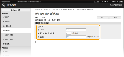 2 | 选择 [通知] 复选框,并指定所需设置。 ![]() [通知] 选中此复选框可将本机的电源状态通知给设备管理软件。当选择 [通知] 时,可以使本机在睡眠模式期间避免不必要的通信,并降低总耗电量。 [端口号] 根据网络环境更改用于此功能的端口号。 [要通过的路由器的数量] 指定通知数据包可以通过多少路由器。 [通知间隔] 指定本机向设备管理软件通知其电源状态的频率。 |