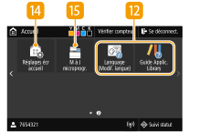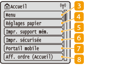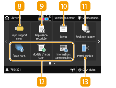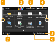 ![]() | <Menu><Réglages des fonctions>, <Préférences> et de nombreux autres réglages de l'appareil sont accessibles depuis ce bouton. Liste du menu des réglages <Réglages papier>Ce bouton permet de spécifier le format et le type du papier chargé dans la cassette à papier et le bac multifonctions. Spécification du format et du type de papier <Impr. support mém.>Imprime des fichiers stockés sur un périphérique mémoire USB. Impression depuis un périphérique mémoire USB (impression support mémoire) <Impr. sécurisée>Utilisez cette fonction pour imprimer un document sécurisé. Impr. d'un document sécurisé par un code PIN (Impression sécurisée) <Portail mobile>Utilisez ce bouton pour établir une connexion avec un appareil mobile. Connexion à des terminaux mobiles <Aff. ordre (Accueil)>Permet de changer l'ordre d'affichage des boutons de l'écran Accueil. Personnalisation de l'écran Accueil |