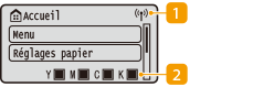 ![]() | Icône Wi-FiCette icône s'affiche si l'appareil est connecté à un réseau local sans fil. Quantité d'encre restante dans les cartouches de tonerAffiche la quantité de toner non consommé dans les cartouches par niveaux. Masqué lorsque l'écran Accueil est actif. |