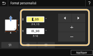 2 | Saisissez la longueur du côté <X> et du côté <Y>. Modèle à écran tactile Sélectionnez <X> ou <Y>, et spécifiez la longueur de chaque côté à l'aide de <+>/<-> et de  /  pour déplacer le curseur entre les chiffres pour entrer des nombres entiers et des fractions. Modèle à LCD noir et blanc Exécutez les étapes suivantes en séquence : <X>  saisissez la longueur du côté <X> à l'aide de  /  et de  /  pour déplacer le curseur d'un chiffre à un autre et entrer des nombres entiers ou des fractions  <Y>  saisissez la longueur du côté <Y>  |