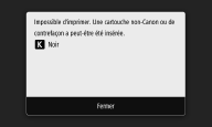 <Impossible d'imprimer. Une cartouche non-Canon ou de contrefaçon a peut-être été insérée.>/<Impossible d'imprimer. Une cartouche non authentique Canon ou une contrefaçon est peut-être utilisée.>