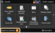 Conditions dans lesquelles un message s'affiche Si une impression est en cours, vous pouvez continuer à imprimer le document. Si un message s'affiche pour la cartouche de toner noir pendant la réception d'un I-Fax ou alors que l'impression automatique d'un rapport est prévue, l'impression n'est pas exécutée pour éviter de produire un imprimé de mauvaise qualité. Pour continuer à imprimer alors que le niveau de toner restant dans la cartouche est faible, réglez <Continuer impr. Si cart. bas>/<Continuer impr. Si niveau cart. bas> sur <Activé>. <Continuer impr. Si cart. bas>/<Continuer impr. Si niveau cart. bas>Définition des conditions dans lesquelles un message doit s'afficher |