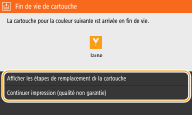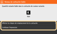 Ce message vous signale qu'une cartouche d'encre doit être bientôt remplacée. Assurez-vous de disposer d'une cartouche de rechange. Remplacez la cartouche de toner si vous voyez ce message avant d'envoyer à l'impression un document volumineux. Ce message s'affiche lorsque <Action en cas d'avertissement> est réglé <Arrêter l'impression> (