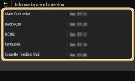 Vous pouvez vérifier la version du microprogramme depuis le panneau de commande de l'appareil. Une fois la mise à jour du microprogramme effectuée, assurez-vous que celle-ci s'est correctement déroulée.Vérification de la version du microprogramme