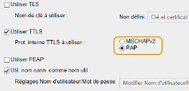 1 | Cochez la case [Utiliser TTLS] ou [Utiliser PEAP]. Protocole interne pour TTLS Vous pouvez sélectionner MSCHAPv2 ou PAP. |