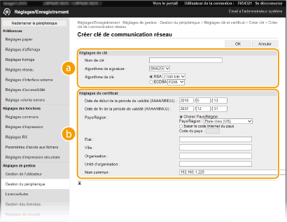 Il est possible de générer une clé avec certificat sur l'appareil lorsque celle-ci est nécessaire pour les communications cryptées via TLS (Transport Layer Security). Vous pouvez faire appel à TLS lors de l'accès à l'appareil depuis l'interface utilisateur distante. Des certificats auto-signés sont utilisés avec la clé avec certificat générée dans "Communication réseau".