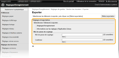 Sélectionnez les réglages à exporter, puis spécifiez le mot de passe de cryptage.