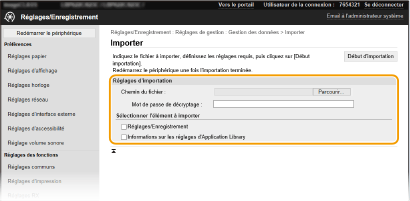 Les données de réglage de l'appareil peuvent être enregistrées sur l'ordinateur (exportation). Les données enregistrées sur votre ordinateur peuvent également être enregistrées sur l'appareil (importation). Comme les données exportées depuis l'appareil peuvent être importées sur d'autres appareils du même modèle, vous disposez d'un moyen simple de copier divers réglages sur plusieurs appareils. Pour utiliser ces fonctions, vous devez vous connecter en tant qu'administrateur système. |