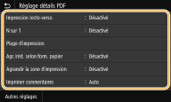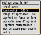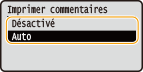 <Imprimer commentaires> Ce réglage spécifie s'il faut imprimer les annotations dans le fichier PDF. <Désactivé> N'imprime aucune annotation. <Auto> Seules sont imprimées les annotations dont l'impression est spécifiée dans le fichier PDF. |