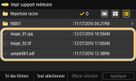 2 | Si les types de fichier sont mélangés, sélectionnez <Fichiers JPEG/TIFF> ou <Fichiers PDF>. |
