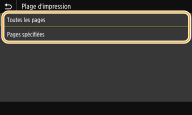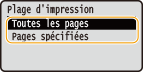 <Plage d'impression> Spécifiez les pages à imprimer. <Toutes les pages> Imprime toutes les pages. <Pages spécifiées> Spécifiez la plage des pages à imprimer lorsque le document contient plusieurs pages. Saisissez le numéro de la <Première page> et de la <Dernière page> à l'aide des touches numériques, puis sélectionnez <Appliquer>. Si la plage des pages spécifiées ne correspond à aucune des pages du fichier PDF, il n'y a pas d'impression. |