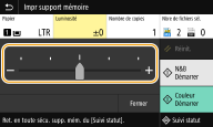 <Luminosité> Vous pouvez régler la luminosité des impressions. Réglez la luminosité et appuyez sur  . Vous pouvez régler la <Luminosité> des fichiers TIFF seulement s'ils sont au format JPEG compressé. |