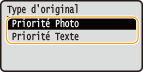 <Type d'original> Vous pouvez sélectionner le type d'original en fonction de l'image à imprimer. <Priorité Photo> Privilégie la qualité de l'image photographique au moment de l'impression. <Priorité Texte> Privilégie la netteté du texte au moment de l'impression. |