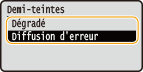 <Demi-teintes> Vous pouvez sélectionner le mode d'impression utilisé pour reproduire les demi-teintes (plage intermédiaire entre les zones claires et les zones foncées d'une image) pour obtenir une qualité d'image optimale. <Dégradé> Applique un lissage fin aux dégradés tels que ceux des photographies numériques lors de leur impression. <Diffusion d'erreur> Ce mode est adapté pour l'impression des données comportant du texte et des lignes fines, pour les lignes courbes des données DAO, etc. La stabilité de la texture et du toner fixé peut être réduite lorsque <Diffusion d'erreur> est utilisé. |
