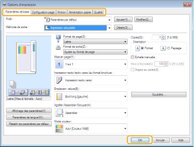 Faites les réglages nécessaires pour l'impression et cliquez sur [OK].