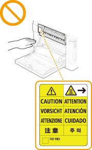 Ne posez pas d'objets lourds sur l'appareil, car leur chute risquerait de vous blesser. Pour votre sécurité, débranchez le cordon d'alimentation si vous prévoyez de ne pas utiliser l'appareil pendant une période prolongée. Faites attention à l'ouverture et à la fermeture des capots de ne pas vous blesser aux mains. Éloignez vos mains ou vos vêtements du rouleau dans la zone de sortie. Une soudaine rotation du rouleau peut happer vos mains ou vos vêtements et provoquer des blessures corporelles. L'intérieur de l'appareil et la fente de sortie peuvent être très chauds pendant et immédiatement après usage. Evitez tout contact avec ces zones pour ne pas vous brûler. Le papier imprimé peut également être très chaud à sa sortie de l'imprimante. Faites bien attention lorsque vous le manipulez. Sinon, vous risquez de vous brûler.