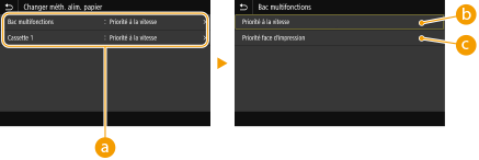 <Bac multifonctions> <Priorité à la vitesse>  <Priorité face d'impression> <Cassette 1> <Priorité à la vitesse>  <Priorité face d'impression> <Cassette 2>* <Priorité à la vitesse>  <Priorité face d'impression> |