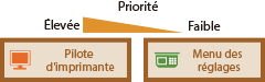 Astérisques (*)Les réglages signalés par "*1" ne s'affichent pas sur tous les modèles ou avec tous les équipements en option ou toutes les options de réglage. Les réglages signalés par le signe "*2" peuvent ne pas être disponibles ou avoir des valeurs par défaut différentes selon votre pays ou région. Les réglages signalés par le signe "*3" ne peuvent pas être importés ou exportés. Priorité des réglagesSi vous définissez un paramètre d'impression depuis le panneau de commande de l'appareil et depuis le pilote d'imprimante, c'est ce dernier qui prévaut. Le paramètre défini depuis le panneau de commande devient opérationnel dans certains cas bien précis, par exemple si vous réalisez des impressions en PS ou PCL ou bien sous UNIX ou autres systèmes d'exploitation pour lesquels les pilotes de cet appareil ne sont pas disponibles. |