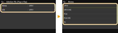 Sélectionnez un langage de description de page de sorte que l'appareil soit détecté en tant qu'imprimante compatible avec ce langage lorsqu'il est relié à un ordinateur par Plug and Play.