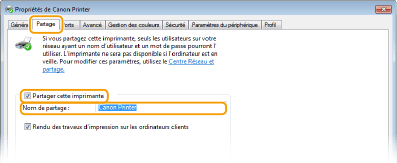Cliquez sur l'onglet [Partage], sélectionnez [Partager cette imprimante] et saisissez le nom de partage de l'appareil.