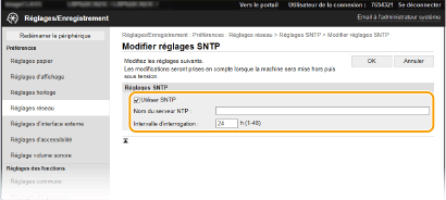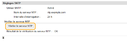 Test des communications avec le serveur NTP/SNTPVous pouvez afficher l'état des communications avec le serveur enregistré en cliquant sur [Réglages/Enregistrement] [Réglages réseau] [Vérifier le serveur NTP] dans [Réglages SNTP]. Si une connexion correcte a été établie, le résultat s'affiche comme indiqué ci-dessous. Veuillez noter que cette opération ne règle pas l'horloge du système.![]() |