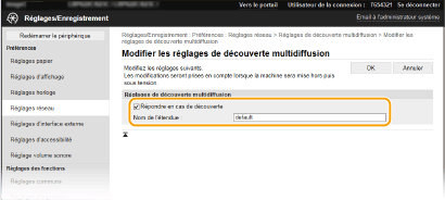 2 | Cochez la case [Répondre en cas de découverte] et définissez les réglages requis. ![]() [Répondre en cas de découverte] Cochez la case pour définir l'appareil de sorte qu'il réponde aux paquets de découverte de multidiffusion et permette la surveillance par le logiciel de gestion des périphériques. ![]() Pour modifier le numéro de port de découverte multidiffusion, reportez-vous à la section Modification des numéros de port. [Nom de l'étendue] Pour inclure l'appareil dans une étendue donnée, entrez un nom d'étendue en caractères alphanumériques. |