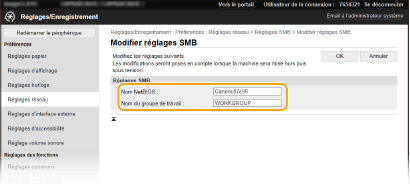 | | Le protocole SMB (Server Message Block) est un protocole consistant à partager les ressources comme des fichiers et des imprimantes avec plusieurs périphériques d'un réseau. Vous devez l'utiliser pour configurer l'appareil en tant qu'imprimante partagée sur un réseau SMB. Selon le réseau utilisé, vous devrez peut-être définir le nom NetBIOS et le nom du groupe de travail. |