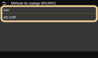 2 | Sélectionnez une méthode de cryptage. ![]() <Auto> Configure l'appareil de sorte qu'il sélectionne automatiquement AES-CCMP ou TKIP conformément au réglage du routeur sans fil. <AES-CCMP> Définit AES-CCMP comme méthode de cryptage. |