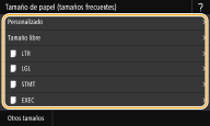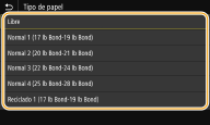Si la pantalla anterior no aparece cuando hay papel cargadoSi siempre carga el mismo papel en la bandeja multiuso, puede omitir las operaciones de configuración del papel registrando el tamaño y el tipo de papel como opción predeterminada. Sin embargo, si se registra la opción predeterminada, la pantalla anterior no aparecerá. Para visualizar la pantalla, seleccione <Especificar cuando cargue papel> (Registro de las opciones de papel predeterminadas para la bandeja multiuso). |