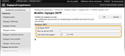 Le SNTP de l'appareil prend en charge les serveurs NTP (version 3) et SNTP (versions 3 et 4). Pour plus d'informations sur les procédures de base à réaliser pour configurer l'appareil depuis l'interface utilisateur distante, voir Configuration des options de menu de l'interface utilisateur distante. |