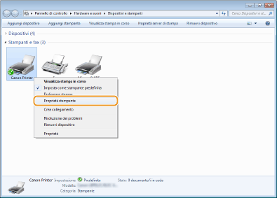 Fare clic con il tasto destro sull'icona del driver della stampante relativo a questa macchina e fare clic su [Proprietà stampante] o [Proprietà].