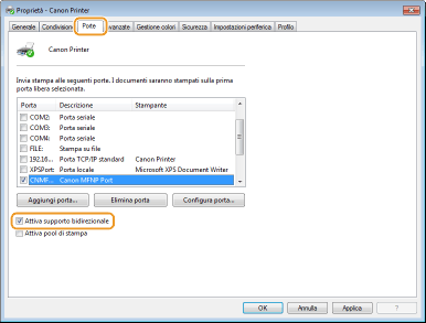 Nella scheda [Porte], verificare che sia selezionata la casella di controllo [Attiva supporto bidirezionale].