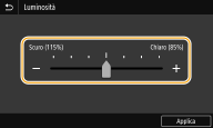 È possibile modificare diverse impostazioni relative alla visualizzazione, come la lingua: <Impostazioni visualizzazione> È possibile cambiare la schermata visualizzata automaticamente quando la macchina non viene utilizzata per uno specificato intervallo di tempo: <Funzione dopo ripristino automatico> È possibile apportare modifiche a varie impostazioni legate all'operatività, come la luminosità dello schermo: <Accessibilità> |