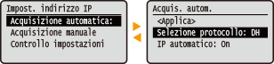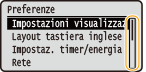 È possibile modificare diverse impostazioni relative alla visualizzazione, come la lingua: <Impostazioni visualizzazione> È possibile cambiare la schermata visualizzata automaticamente quando la macchina non viene utilizzata per uno specificato intervallo di tempo: <Funzione dopo ripristino automatico> È possibile modificare diverse impostazioni relative all'accessibilità, come la velocità di scorrimento: <Accessibilità> |