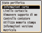 <Rimuovere supporto di memoria>Consente di rimuovere in sicurezza un dispositivo di memoria USB. Viene visualizzato quando un tale dispositivo viene collegato alla macchina.