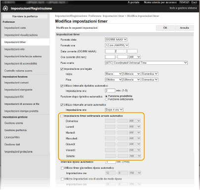 Selezionare la casella di controllo per [Impostazione timer settimanale arresto automatico] e impostare l'ora di spegnimento.