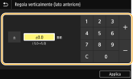 Quando si regola la posizione di stampa, specificare la direzione usando "+" e "-" e la distanza usando "mm". Per <Regola vertic. (lato anteriore)>/<Regola vert. (lato posteriore)>, specificare un valore con un segno "+" per spostare la posizione di stampa in direzione dall'alto in basso. Per <Regola orizz. (lato anteriore)>/<Regola orizz. (lato posteriore)>, specificare un valore con un segno "+" per spostare la posizione di stampa in direzione da sinistra a destra. Per spostarsi in direzione inversa, specificare un valore con un segno "-".